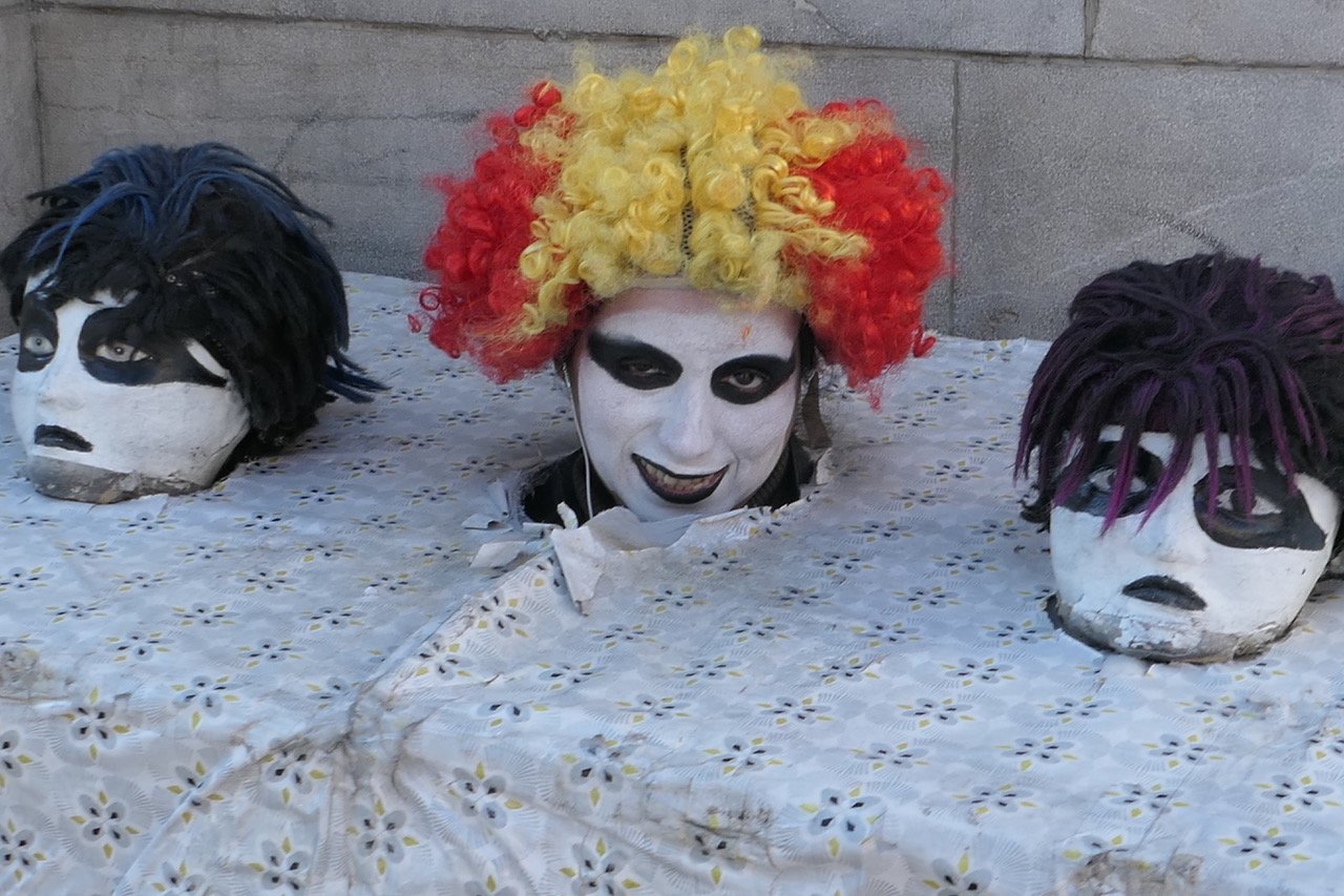 We hadn’t gotten far when we saw a table covered with a white tablecloth that hung to the sidewalk that had three heads sitting on top of it. The funky wigged heads were painted like mimes with white faces, black lips, and black paint circling staring eyes. I didn’t understand the reason for mannequin heads just sitting on a table until I got closer and one winked at me. “Ah hah!” I said to the winker, letting them know I understood their purpose.