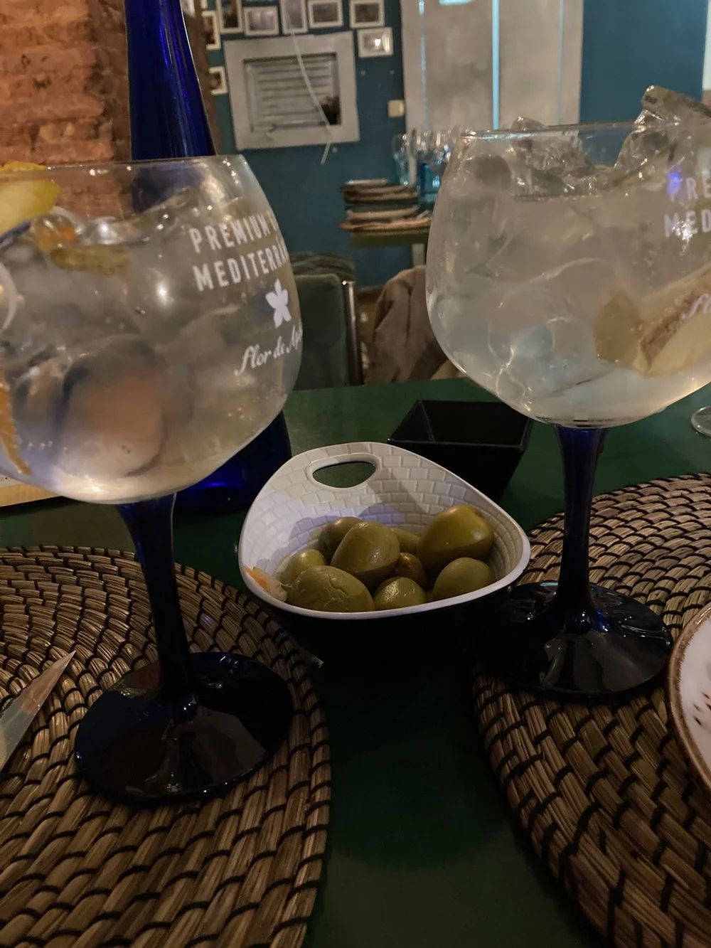 On our first night in Madrid, my husband, Marty found a fun-sounding gin bar online that was just around the corner from where we were staying and made reservations for dinner. On the outside, the place looked like an old worn-out hippie hangout with peeling paint and dirty windows. But when entering, it was very upscale with warm pale-yellow walls, lots of greenery, ambient lighting, and comfortable chairs at black tables covered with squares of white linen.